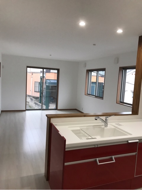 投稿日: 2017年4月10日現場進捗状況(^^) 呉市 下山田町H様邸の現場風景です 掃除が完了して、内部の養生も撤去されました 白を基調としたリビングには、赤いキッチンが存在感を出しています 和室にも、畳が搬入されグッとしまりました 可動棚を設けて、収納たっぷりの洗面所は、タオルや着替え、買い置きの洗剤等が沢山収納出来ますね 外部も、これから外構工事が始まります 現場は順調に進んでいますので、お楽しみに〜