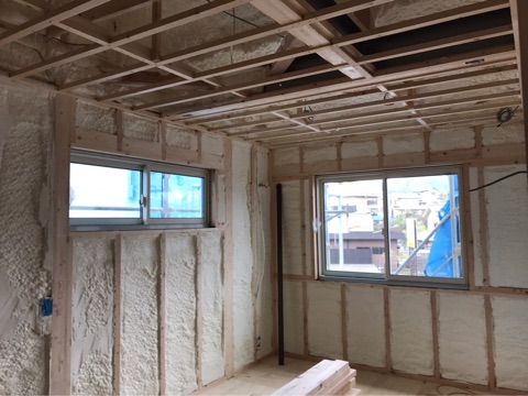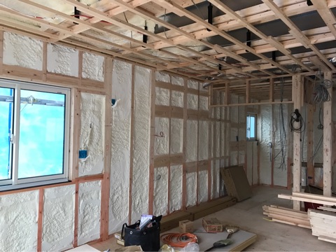 投稿日: 2017年4月20日現場進捗状況(^^) 呉市 焼山中央2丁目1号地の現場風景です 内部は、ウレタン断熱工事が完了しました 隙間なくウレタン断熱材を施工していますので、高い断熱効果を発揮してくれます 外部は、外壁工事の下準備工事が行われていました この後、外壁工事が行われていきますので、外観がガラリと変わって来ますのでお楽しみに〜