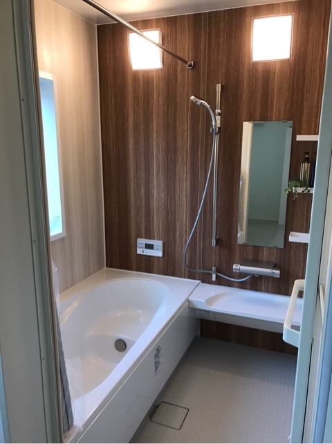 お風呂はアクセントパネルと、白いパネルとでメリハリを持たせた空間になりました