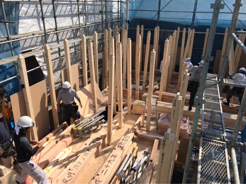 投稿日: 2017年5月29日現場進捗状況(^^) 安芸区 船越N様邸の現場風景です 本日、無事に上棟を迎えることが出来ました 二階部分の柱立ての風景です 二階部分の三階部分の床組風景です 下からみるとこんな感じで作業が進んでいます 三階部分の施工風景です 屋根部分の施工風景です 最後に、雨対策のルーフィングを貼って無事に上棟は終了です これから、工事が進むに連れて現場の様子が変わって行きますので、お楽しみに〜