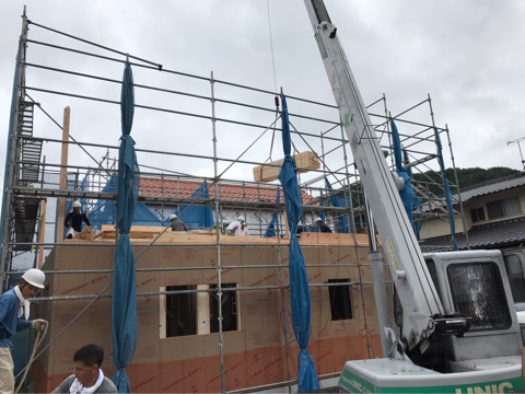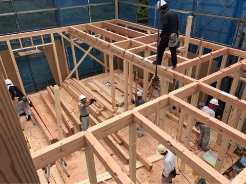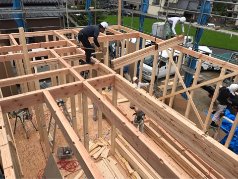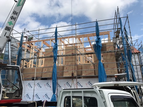 投稿日: 2017年7月18日 投稿者: pana-k04現場進捗状況(^^) 安芸区 中野東5丁目2号地の現場風景です 天気が心配されましたが、無事に上棟を迎えました 一階の棟上げ風景です 一階の面材を施工しています 2階部分の棟上げ風景です 屋根組みが行われています 野地板が施工されました 夕方には、無事に棟上げが完了しました これから、現場が進むに連れてブログにてお知らせしますので、お楽しみに〜