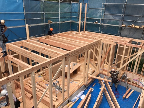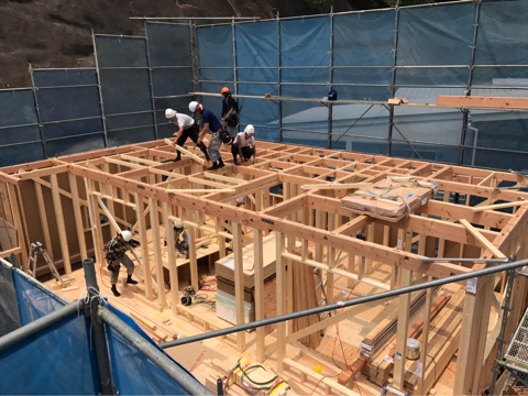 投稿日: 2017年7月28日現場進捗状況(^^) 安芸郡 海田町寺迫K様邸の現場風景です 本日、無事に上棟を迎えましたK様邸です 一階部分の施工風景です 二階部分の施工風景です お昼前には、二階の梁まで施工されました 午後からは、屋根工事にうつります 垂木を施工して 野地板を施工すると上棟はほぼ完了です 夕方には、雨じまいもして無事に上棟が完了しましたの これから、現場が進んで行きますのでお楽しみに〜