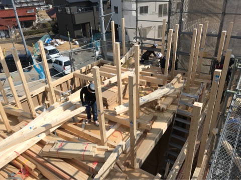 投稿日: 2018年2月26日現場進捗状況(^^) 東広島市 西条町御薗宇K様邸の現場風景です 本日、無事に上棟を迎えました 一階部分の建て方風景です 二階の床合板施工風景です 外部も合わせて作業が進んでいます 二階部分の建て方風景です いよいよ屋根の作業に入っていきます 夕方には、屋根が完成しました 同時に、外部の作業も進んでいます 夕方には無事に上棟作業も完了しました これから、工事が進むにつれて、色々なところが変わって行きますので、お楽しみに〜