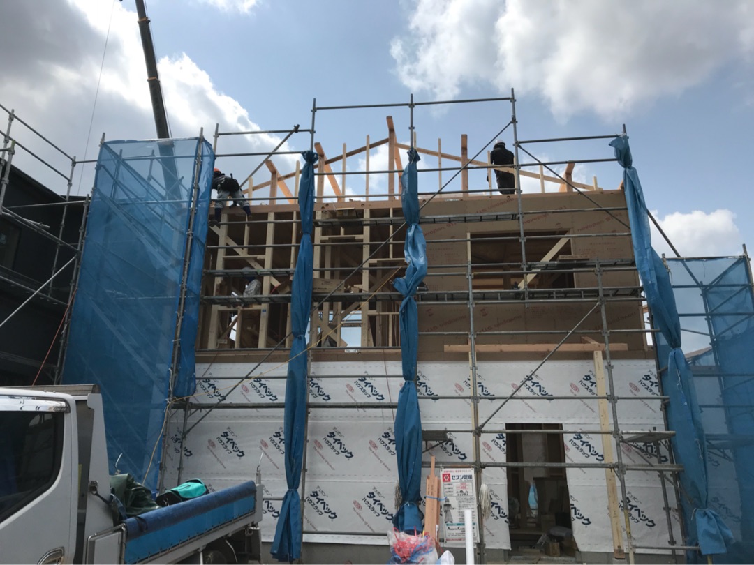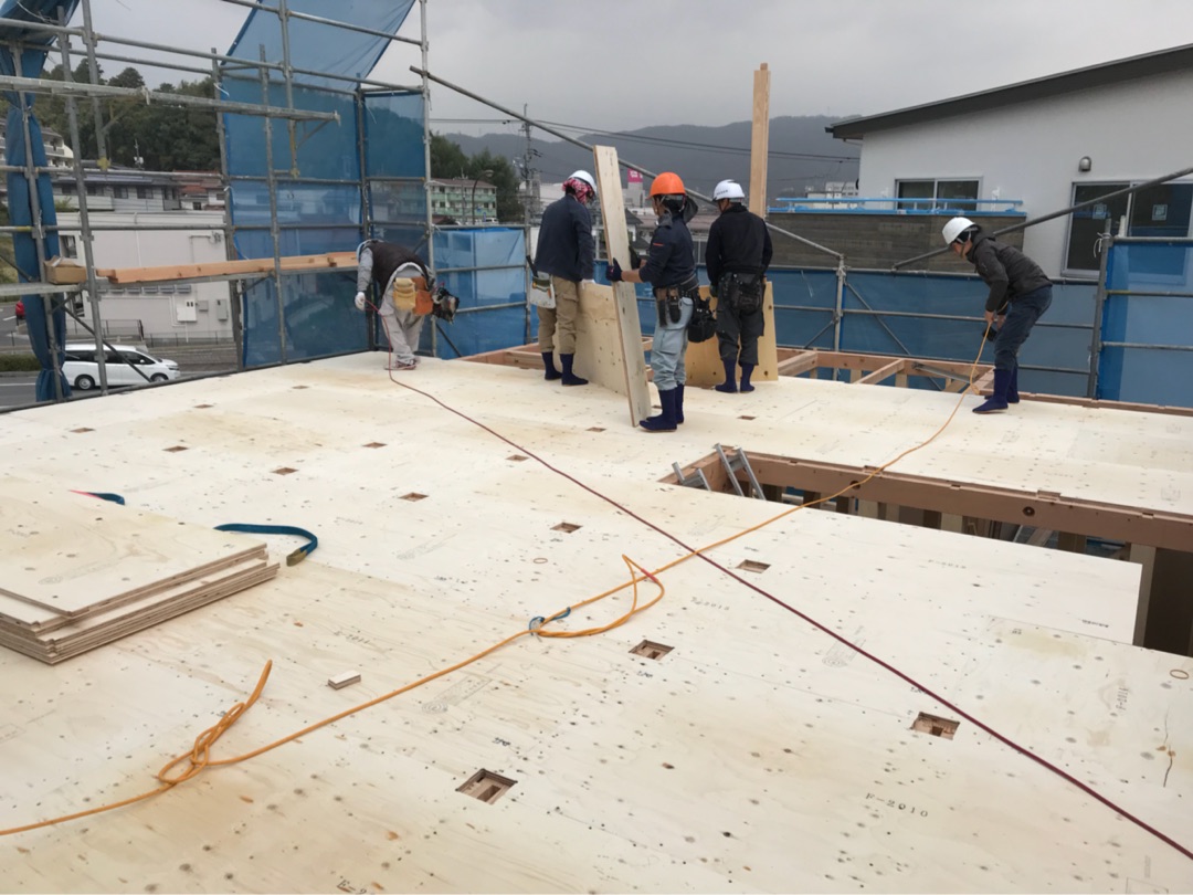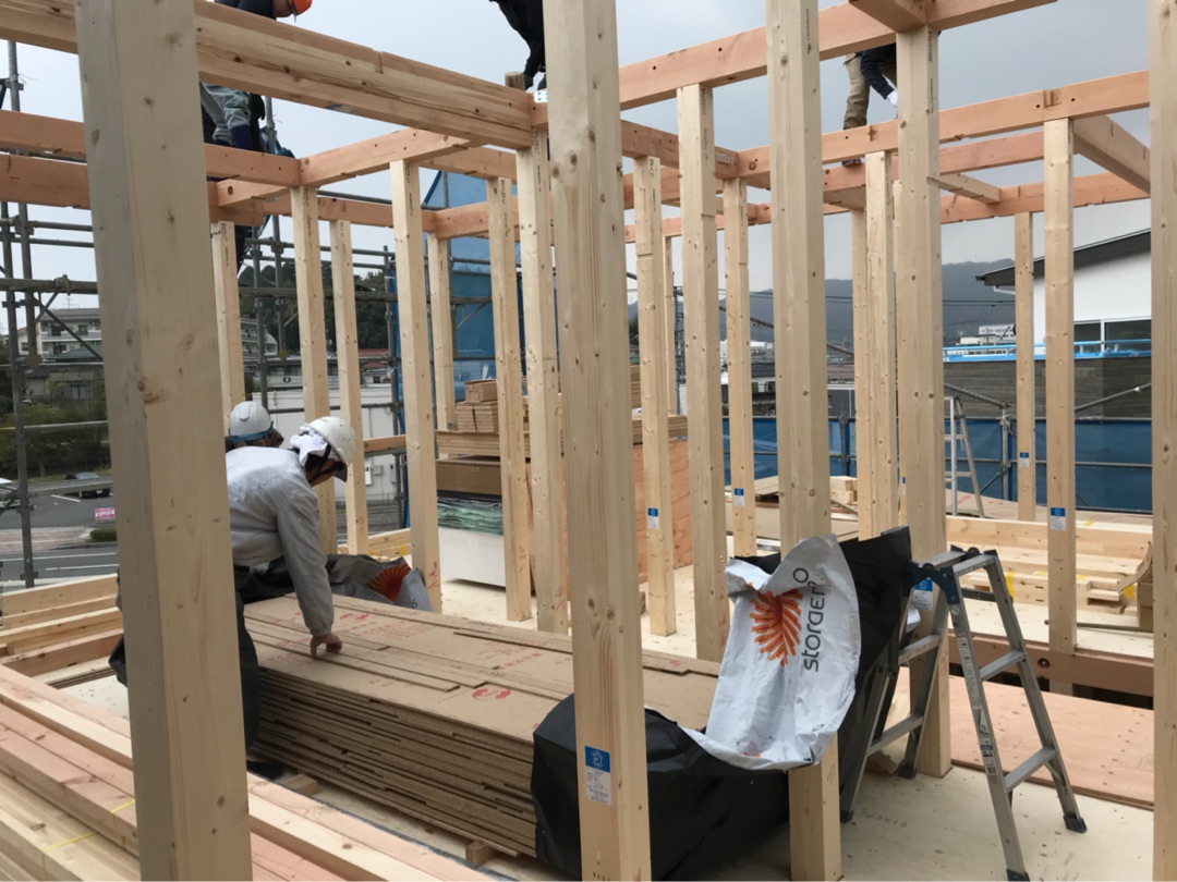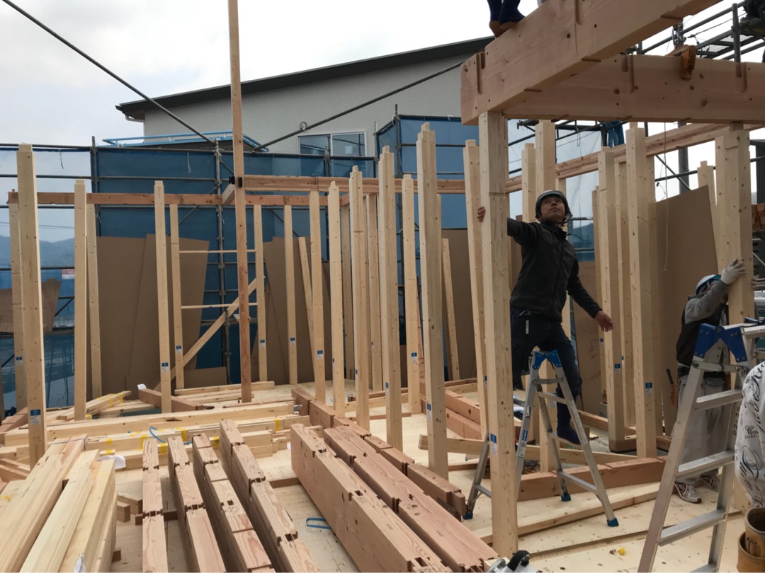 投稿日: 2018年4月7日現場進捗状況(^^) 東広島市 西条町御薗宇T様邸の現場風景です 本日、無事に上棟を迎えました まずは、一階の柱立てからスタートです 一階の柱立てが終わると、二階部分の桁を施工します 二階の桁が施工されると、上はこのような感じでになります 二階の桁が施工されているのと同時に、外部の面材も施工されて行きます 二階の床合板が施工されました 次は、二回の柱立てと桁組みです 午後からは、屋根工事へと移ります 屋根工事が行われている頃には、二階の外部面材も施工が進んでいます 夕方には、屋根にルーフィングを貼り上棟が完了です 外部は、この通り 無事に上棟が完了しました これから、工事が進むに連れて現場の様子が変わって行きますので、お楽しみに〜 本日は、上棟おめでとうございます