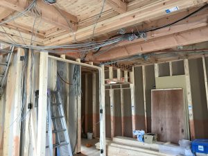 内部では、サッシが取り付けられて電気配線工事が終わりました![]()
