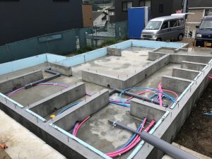 基礎の外周は断熱材で覆われる仕様になっています![]()