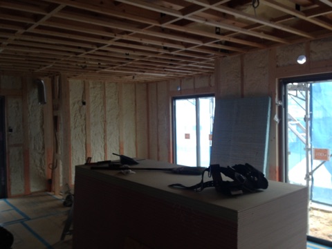 投稿日: 2017年3月6日現場進捗状況(^^) 呉市 焼山北12号地の現場風景です 内部は、ウレタン断熱工事完了しています 家全体をすっぽりと包むウレタン断熱材によって、外部との隙間を減らし内部の暖気、冷気を逃しにくくしています 外部は、外壁工事の下準備中です 外壁工事が始まると、外観がガラリと変わりますのでお楽しみに〜