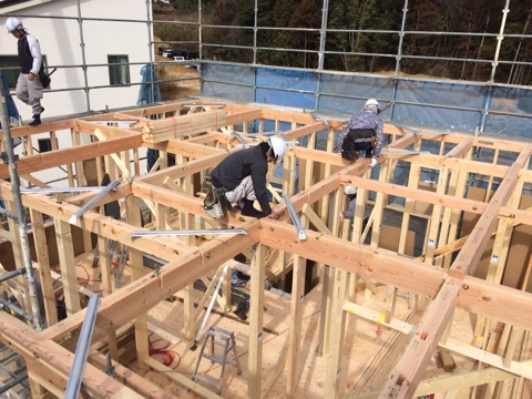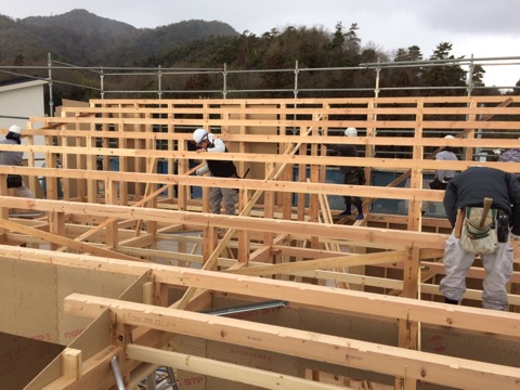 投稿日: 2017年2月8日現場進捗状況(^^) 呉市 焼山北12号地の現場風景です 昨日、上棟を迎えました 時折みぞれが舞う中での上棟は寒さとの戦いでしたが、無事に上棟を完了しました 太陽光パネルが10kw以上載るこの現場は、駐車場スペースも広々としており立地条件の現場になってます 工事の進捗をちょくちょくアップして行くので、お楽しみに〜