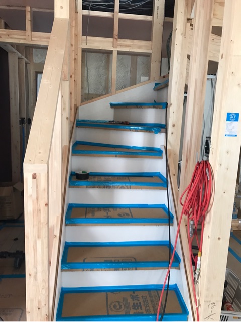 投稿日: 2017年5月17日現場進捗状況(^^) 安芸郡 海田町寺迫T様邸の現場風景です 内部では、階段が施工されていました これで、二階への上がり下りが安全に行って頂けます また、ウレタン断熱も終わり、天井工事へと進んで行きます 天井が施工されると、天井高が確認して頂けますので、空間的なイメージが湧きやすくなりますよ 現場は順調に進んでいますので、お楽しみに〜